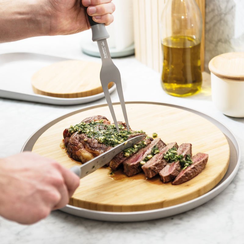 Slice your turkey, ham or Sunday roast as thin as you want with the Leo carving set. The carving fork holds your meat securely in place with its two sharp tines while you use the thin sharp blade of the carving knife to carve the meat precisely. Both the carving fork and carving knife have a soft-touch handle that’s comfortable to hold in your hand and well-balanced. Gather everyone around the dinner table and impress them with your carving skills!