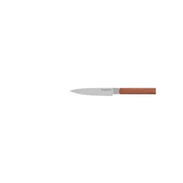 This 3-piece set includes a serrated utility knife, a chef’s knife and a santoku knife, the perfect starter knife set in your kitchen! The all-rounder chef’s knife is for slicing and dicing, the serrated utility knife cuts clean food with a hard exterior and soft interior and the santoku is perfect for chopping, slicing and dicing the ingredients. The stylish wooden handles with satin finish give you a secure and comfortable grip, while adding that extra glamour you’re looking for!