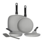 Composition | 1 x Frying pan non-stick Glints Spirit 20,00 cm – 8″ (SKU 3950603) (1,20 L / 1.25qt) 1 x Frying pan non-stick Glints Spirit 24,00 cm – 9.5″ (SKU 3950604) (1,85 L / 2qt) 1 x Grill pan non-stick Glints Spirit 26,00 cm – 10″ (SKU 3950608) (2,35 L / 2.5qt) 1 x Pancake pan non-stick Glints Spirit 24,00 cm – 9.5″ (SKU 3950607) (0,70 L / 24oz) 1 x Slotted Turner Balance 35,00 x 8,00 x 4,50 cm – 14 x 3 x 2″ (SKU 3950416) |