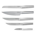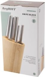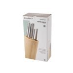 | Composition | 1 x paring knife – 8 cm (3″) 1 x utility knife – 12 cm (5″) 1 x bread knife – 20 cm (8″) 1 x carving knife – 20 cm (8″) 1 x chef’s knife – 20 cm (8″) 1 x wooden block – 22 Ă— 10 Ă— 19 cm (9 Ă— 4 Ă— 7.5″) |