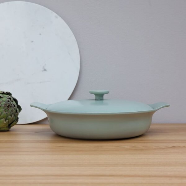A classic dish such as a juicy chicken breast with seasonal veggies needs a classic pot. This cast iron skillet with superior heat retention is perfect for the job! The mint green exterior gives the skillet a contemporary look and feel while the cream coloured enamelled interior is very easy to clean. The condensation bumps on the lid collect the vapours and direct them back on the food, resulting in moist and savoury meats, fish and poultry.