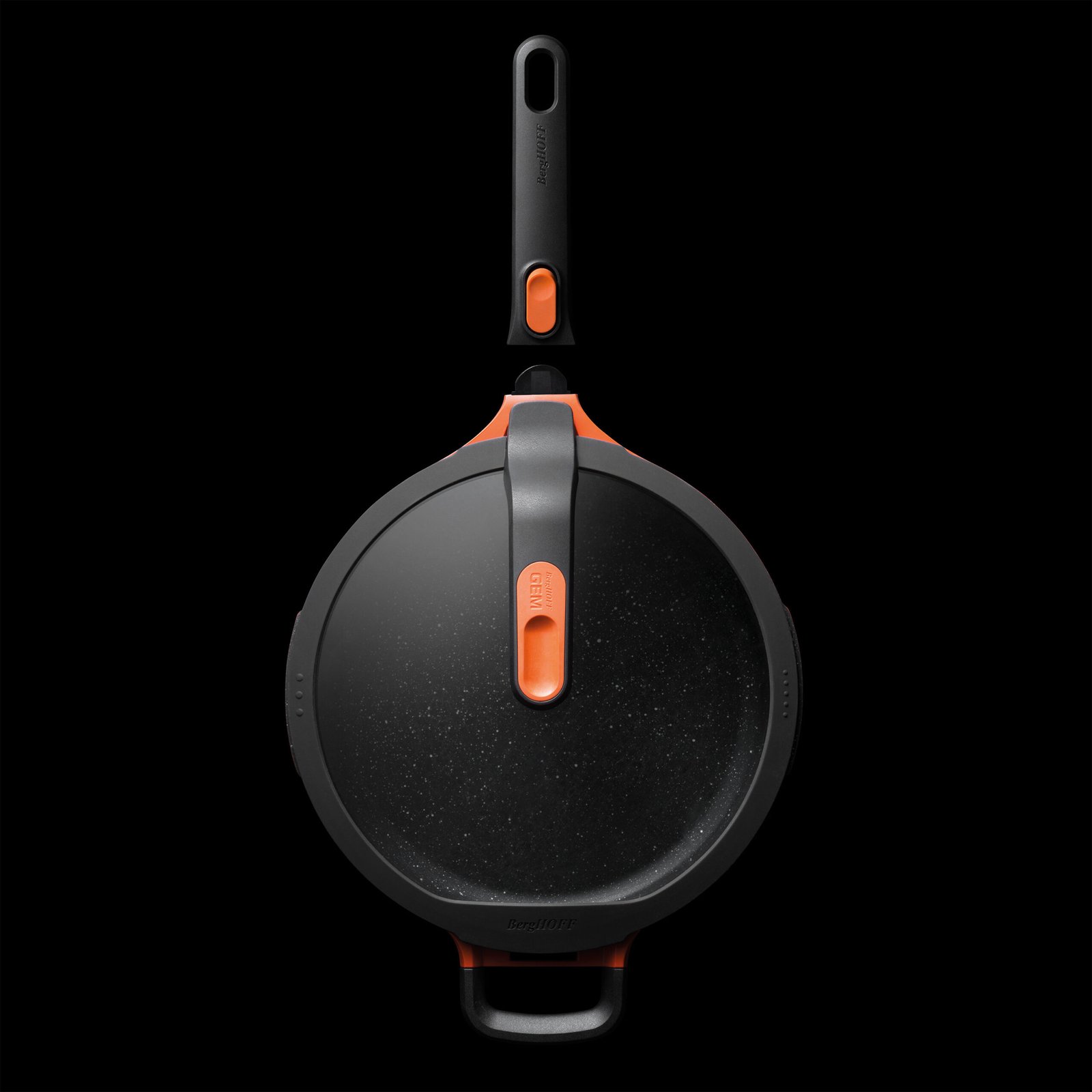 Whether you want to sauté vegetables, fry several pieces of fish or pop your seared meat in the oven for further cooking, this sauté pan is always ready to lend a hand. The high-quality non-stick coating along with the easily detachable handle and the convenient pouring rims make this sauté pan a dream to use. Add to this the glass cover that can be positioned vertically on the body of the pot to avoid condensation drops on your stovetop and you’ve got a piece of cookware that will steal your heart in no time!