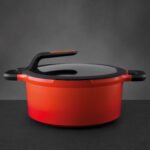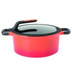 With a capacity of 7,3 litres, this aluminium stockpot is a great size to prepare a family meal. Whether you’re making soup, stew or stock, this brightly-coloured pot with convenient pouring rims, a multilayered non-stick coating and comfortable stay-cool handles is always up for the job. An added bonus is the glass lid that has an ergonomic handle as well as two different sized pouring areas for precise straining of various ingredients and can be positioned vertically on the pot so that you won’t get any condensation drops on your stovetop and always have a free hand to stir and serve.