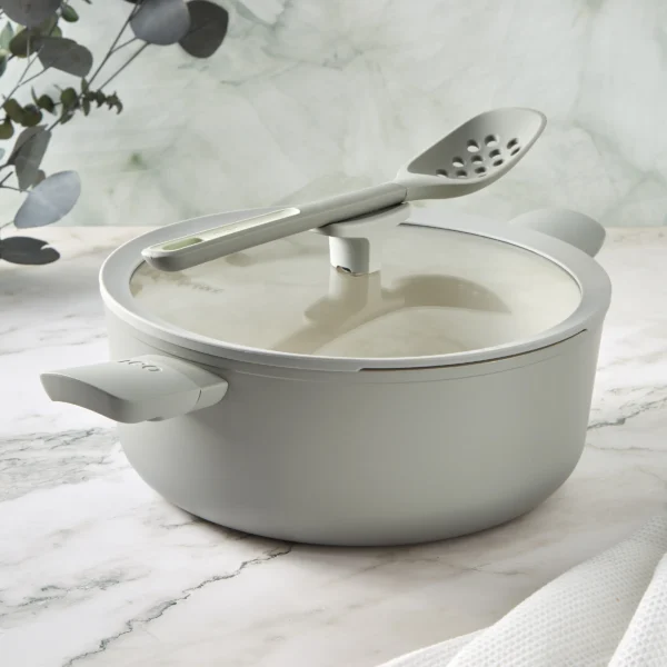 Want to boil a batch of pasta, make your favourite soup or slow-cook a stock? Then you’ll need a stockpot you can count on! This 24 cm casserole with 100% recycled aluminium body, has a high-quality, sustainable and healthy ceramic non-stick coating which allows you to cook with little to no fat and is the perfect fit for any kind of stovetop, including induction. Not only is the material lightweight to handle, it also ensures a fast and even, energy-efficient, heat distribution. The clear glass lid that lets you keep an eye on your food and comes with an integrated drain hole for easy straining.