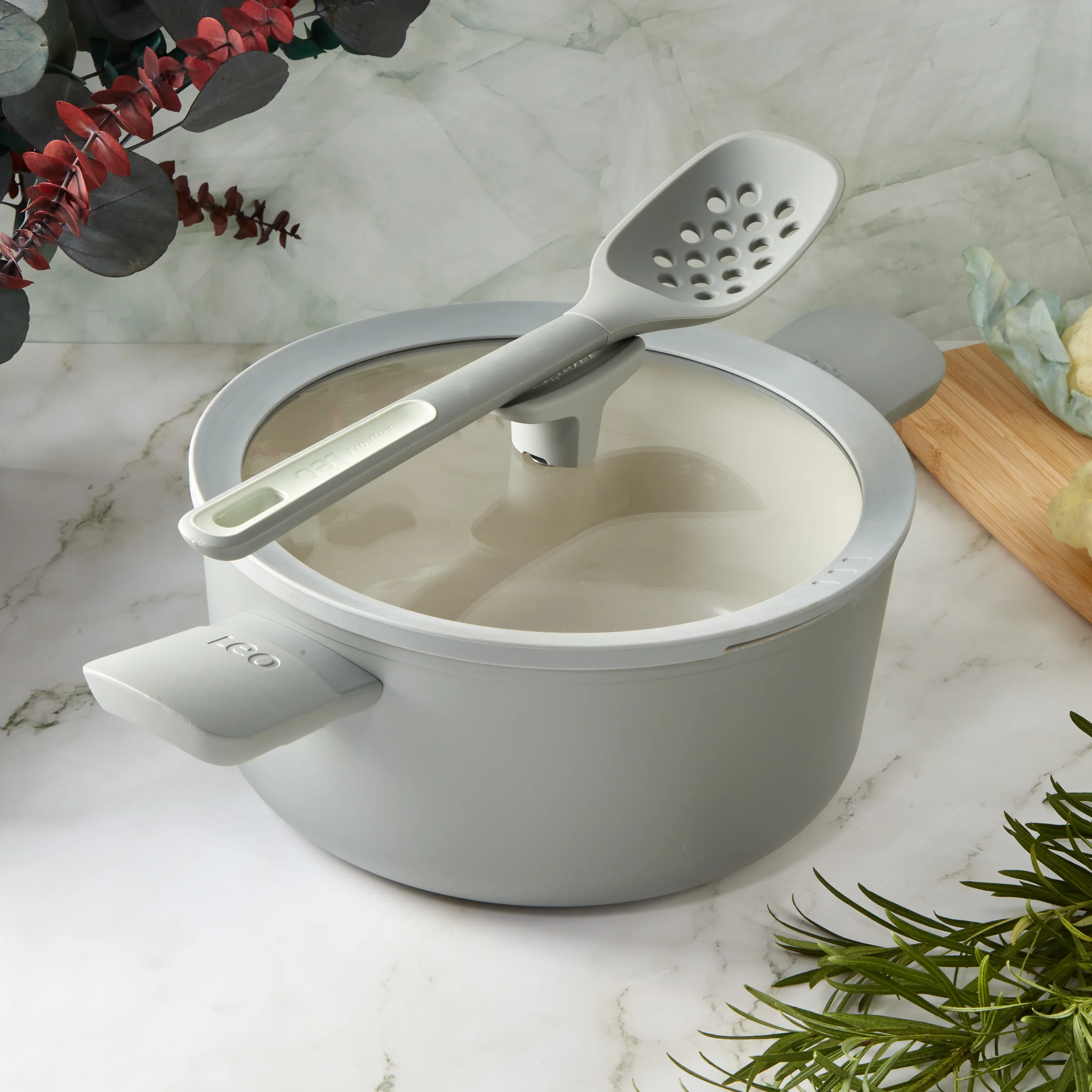 If you’re rustling up a big batch of homemade soup or a tasty stew in this 100% recycled aluminium stockpot, you’ll no doubt appreciate the pot’s fast and even, energy-efficient heat distribution on any kind of stovetop, including induction. The high-quality, sustainable and healthy ceramic non-stick coating ensures an easy food release and the soft-touch stay-cool handles are equipped with a comfortable grip and the knob of the glass lid is equipped with a spoon rest knob. Want to make sure all those delicious flavours are preserved and you don’t lose any valuable energy? Just use the clear glass lid that allows you to keep an eye on your food without having to lift the lid and comes with a drain hole so you can easily strain the pot’s contents if needed.