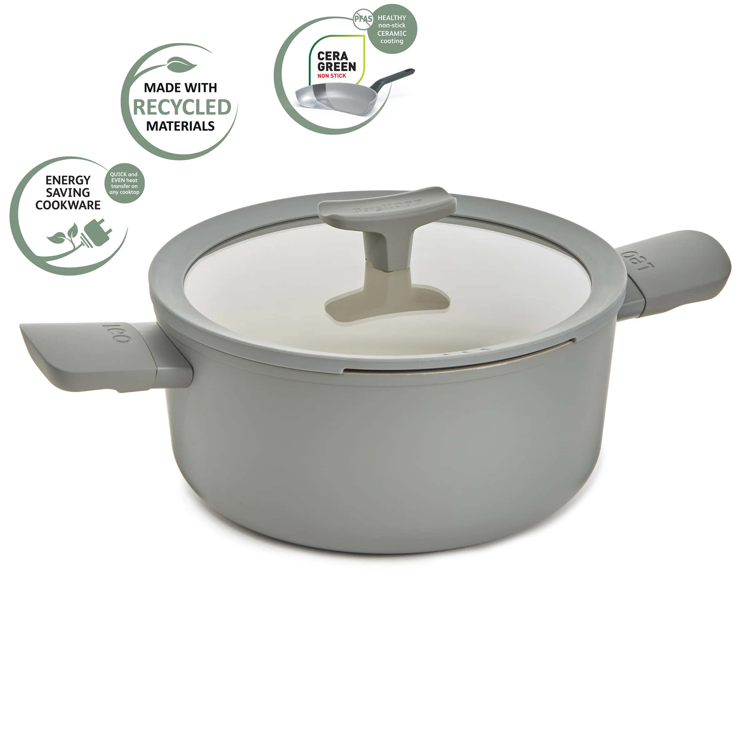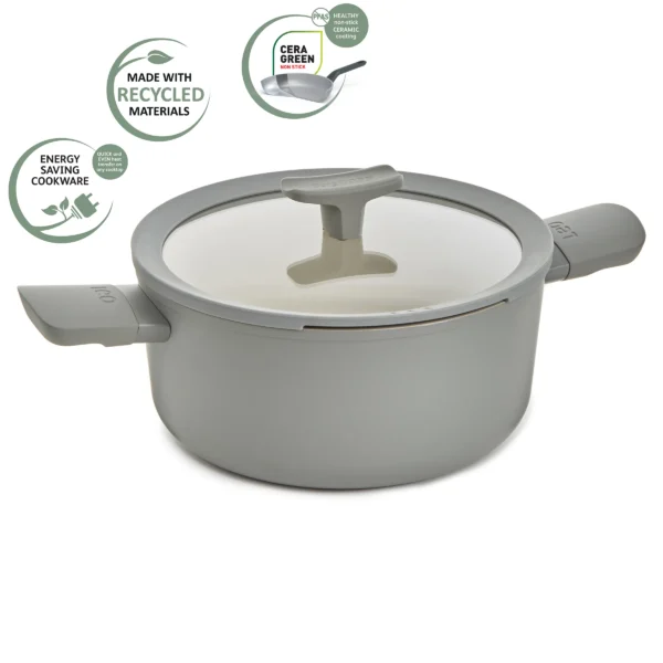 Unique features | Clear glass cover with integrated air duct and straining function Special knob with spoon rest function Made with recycled aluminium Healthy CeraGreen ceramic non-stick coating (PFAS-free) Full disk base that conducts heat fast and evenly for energy-efficient cooking Suitable for all cooktops including induction and downdraft exhaust systems Ovenproof up to 180°C / 356°F |