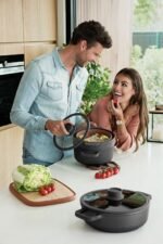 | Unique features | Lightweight material that’s easy to handle High-quality non-stick coating Easy to clean Easy food release Cover with silicone rim that prevents rattling Special knob with spoon rest function The collapsible steamer insert “Steam and Strain” fits on the stockpot Glass cover with integrated venting hole Ovenproof up to 180°C / 356°F |