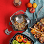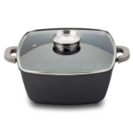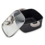 Enjoy cooking with the die cast square casserole-roaster FUNTZIO with 5 layers of nonstick stone coating. The ultra durable non-stick coating offers perfect taste like cooked in natural stone, ensuring totally healthy cooking, high resistance like stone and easy cleaning. Fabrication involves low-carbon footprint processes and excludes PFOA. The compact composition of the metal and the heavy bottom, help to transmit the heat evenly over the entire surface of the grill. This ensures even cooking, while at the same time allows you to save energy by cooking at low temperatures. High resistant glass lid with a special port that facilitates the addition of liquid ingredients when used in the oven completes the durability and high-quality of the product.