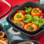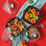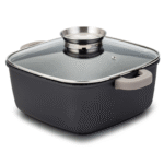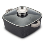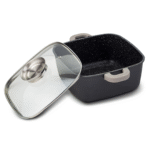 – Highly resistant glass lid with a special port on handle that facilitates the addition of liquid ingredients when used in the oven