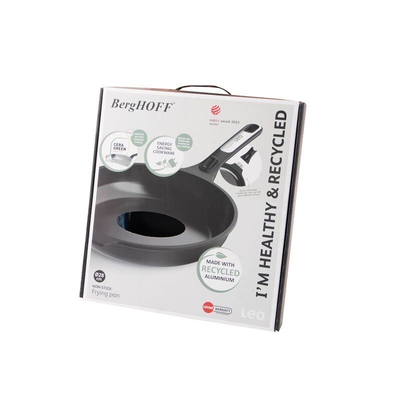 Sizzle some sausages, pan-fry a batch of Brussels sprouts or fry your eggs sunny side up, this 28 cm recycled aluminium frying pan will save you time in the kitchen. Thanks to the healthy ceramic CeraGreen non-stick coating you don’t need to use a lot of oil, your food easily slides onto your plate and the clean-up is a breeze! On top of that, the pan’s base ensures a fast and even heat transfer for energy-efficient cooking and the detachable handle allows you to place the frying pan in the oven of store it efficiently