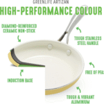 - This collection’s diamond-reinforced coating is incredibly durable