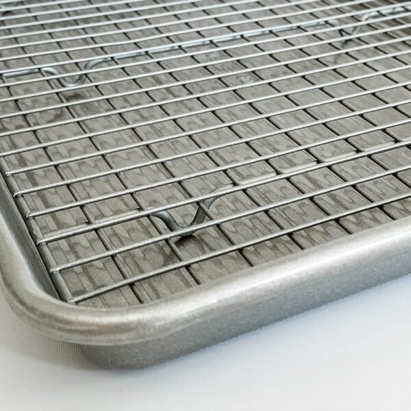 This dynamic duo is an absolute essential for the home baker. Our half sheet pan with matching baking or cooling rack is just what you need to turn out cookies, scones, frozen desserts, roasted veggies and more. Use the rack inside the baking sheet to glaze desserts or bake bacon. Outside the pan the cooling rack’s steel cross wire design with six raised feet cools your delicate baked goods. The sheet pan is made with aluminized steel for even heat distribution and durability. In addition, the ridged bottom surface allows air to circulate for even, uniform results. The edges are reinforced steel wire to aid in warp resistance and grip for transport from hot oven to countertop. But perhaps the best feature is our proprietary nonstick coating, Americoat. Food safe and prized in commercial kitchens around the world, Americoat sets the standard in food release. Food slides right off – so that means clean-up is a snap.