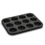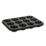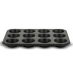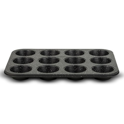 The muffin tray is made of carbon steel, which offers even heat distribution for better baking results. The non-stick stone coating ensures easy removal of the muffins from the pan without destroying them, as well as easy cleaning of the tray after use.