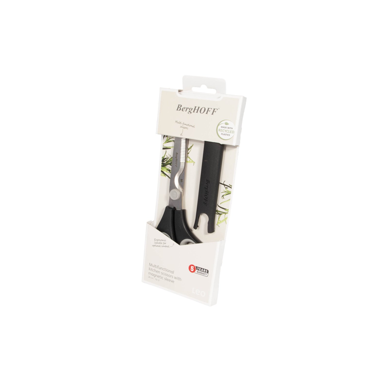 Unique features Magnetic sleeve keeps the blades safe and protected; Integrated screw cap opener; The magnetic sleeve enables scissors to be conveniently stored on magnetic surfaces, such as magnetic knife strips; Handle made with recycled plastics