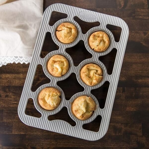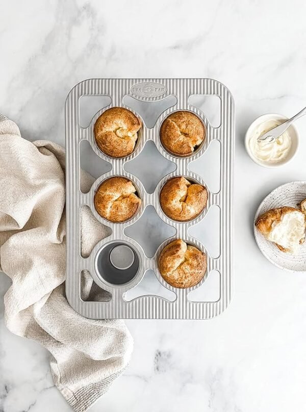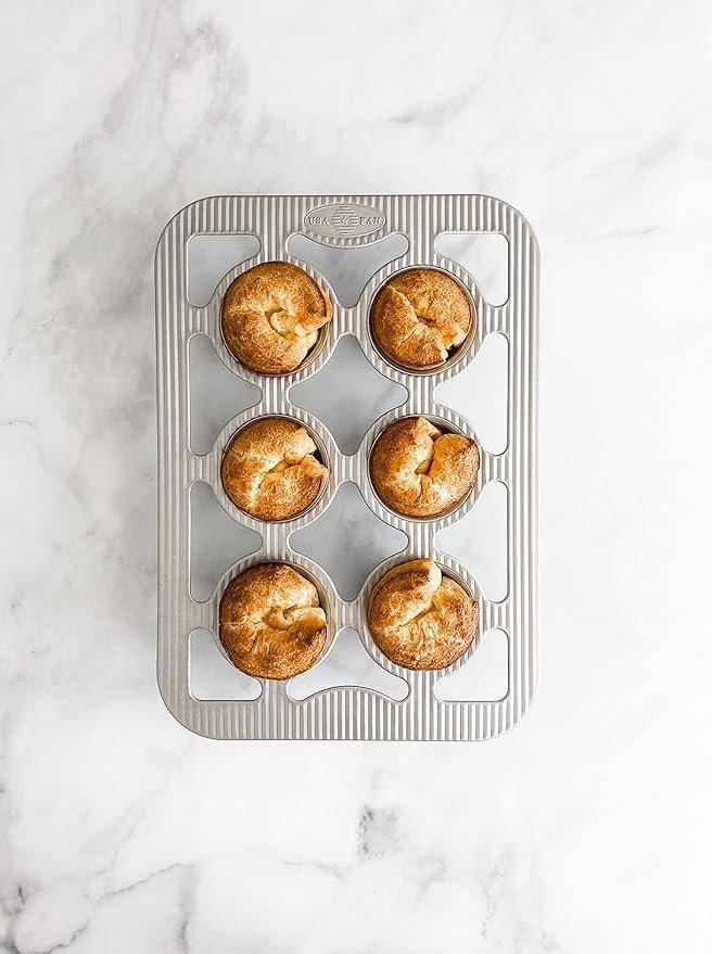 If you want light, fluffy popovers with their defining tall-rise, then you want our popover pan. With its six, straight sided cavities, you get the signature “pop” over the pan. Make your popovers savory or sweet, or use our bakeware for fluffy bread rolls, muffins, and more. You can be assured of consistent results with our heavy duty pans used in commercial kitchens around the world. The high quality, aluminized steel is durable, strong, and conducts heat evenly. The unique rippling on our pans aids in air circulation to enhance baking and browning as well as providing additional strength and warp resistance. The rims are reinforced for strength and easy grasping with oven-mitted hands. But it’s our nonstick coating that really takes the cake, ahem, popover. It releases each roll perfectly so you can enjoy each treat AND the easy clean up.