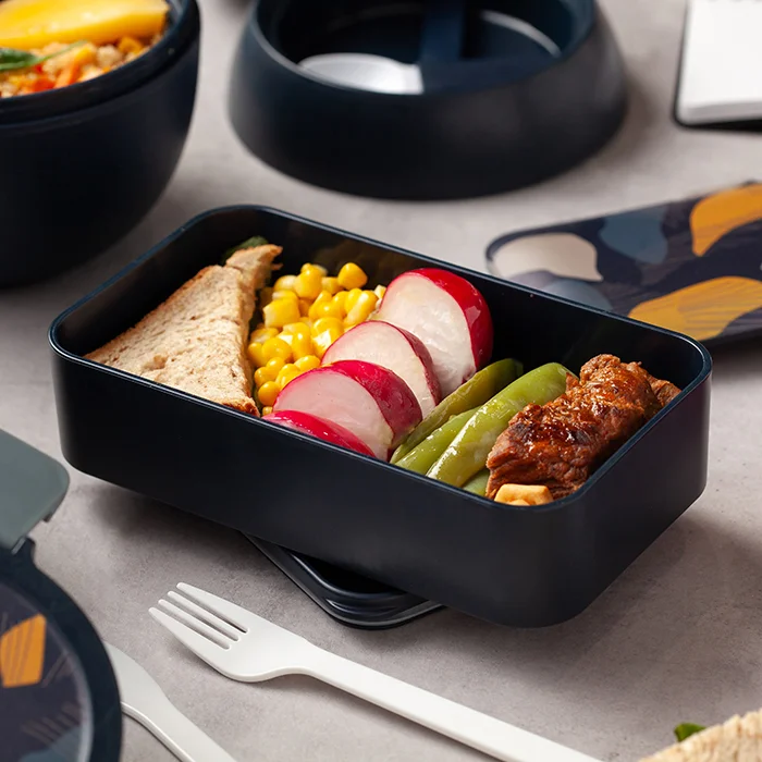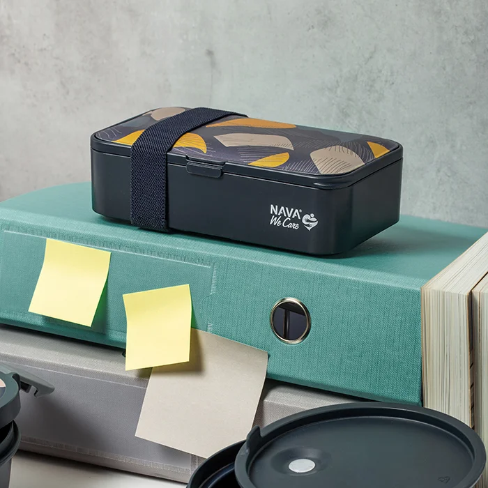 The rectangular 650ml We Care food container by Nava, with integrated fork, spoon and knife inside the lid, is the ideal container for transporting and storing your food.