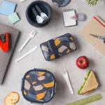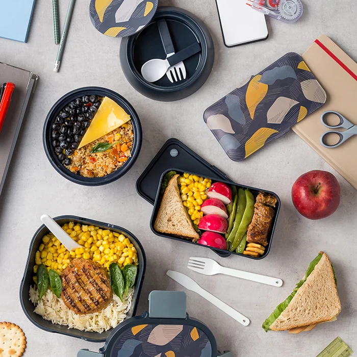 The lid has a silicone ring for an airtight closure to prevent any leaks during transport. There is a compartment in the lid and inside you will find a spoon, fork and knife. An elastic band secures the container additionally.
