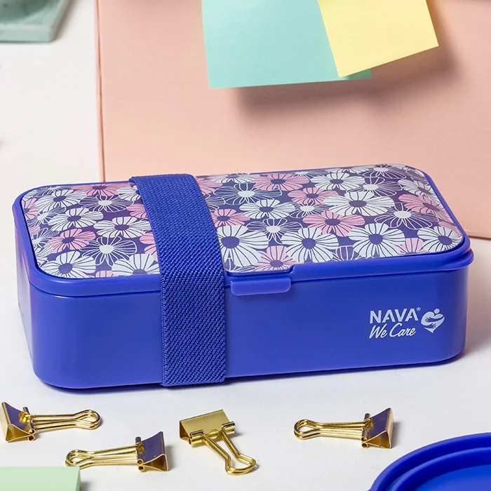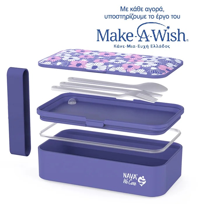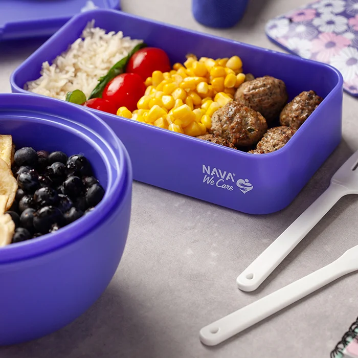 The rectangular 650ml We Care food container by Nava, with integrated fork, spoon and knife inside the lid, is the ideal container for transporting and storing your food.