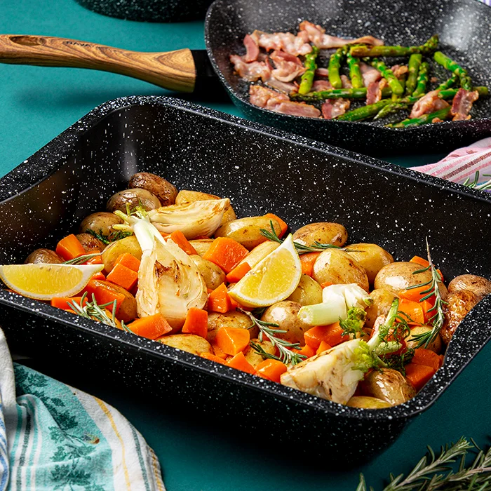 The roaster is made of carbon steel, which ensures uniform heat distribution and, thus, better cooking results. The non-stick stone coating allows easy removal of food as well as easy cleaning of the roaster after use.