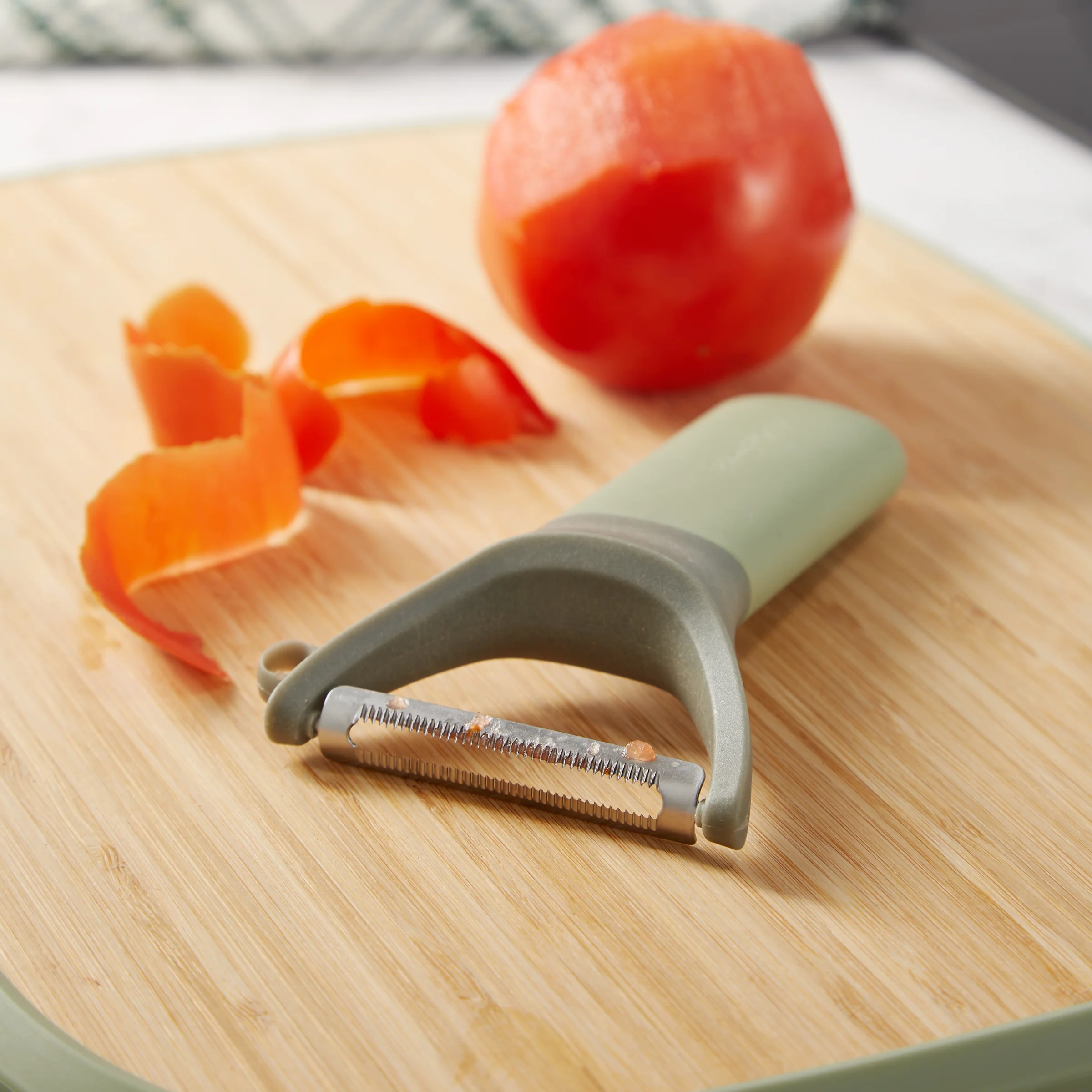 Peel your fruit or vegetables with this peeler with ergonomic soft-touch handle made with recycled plastic. The sharp stainless steel blade is perfect for quick and easy peeling. Clean the peeler by putting it into the dishwasher.