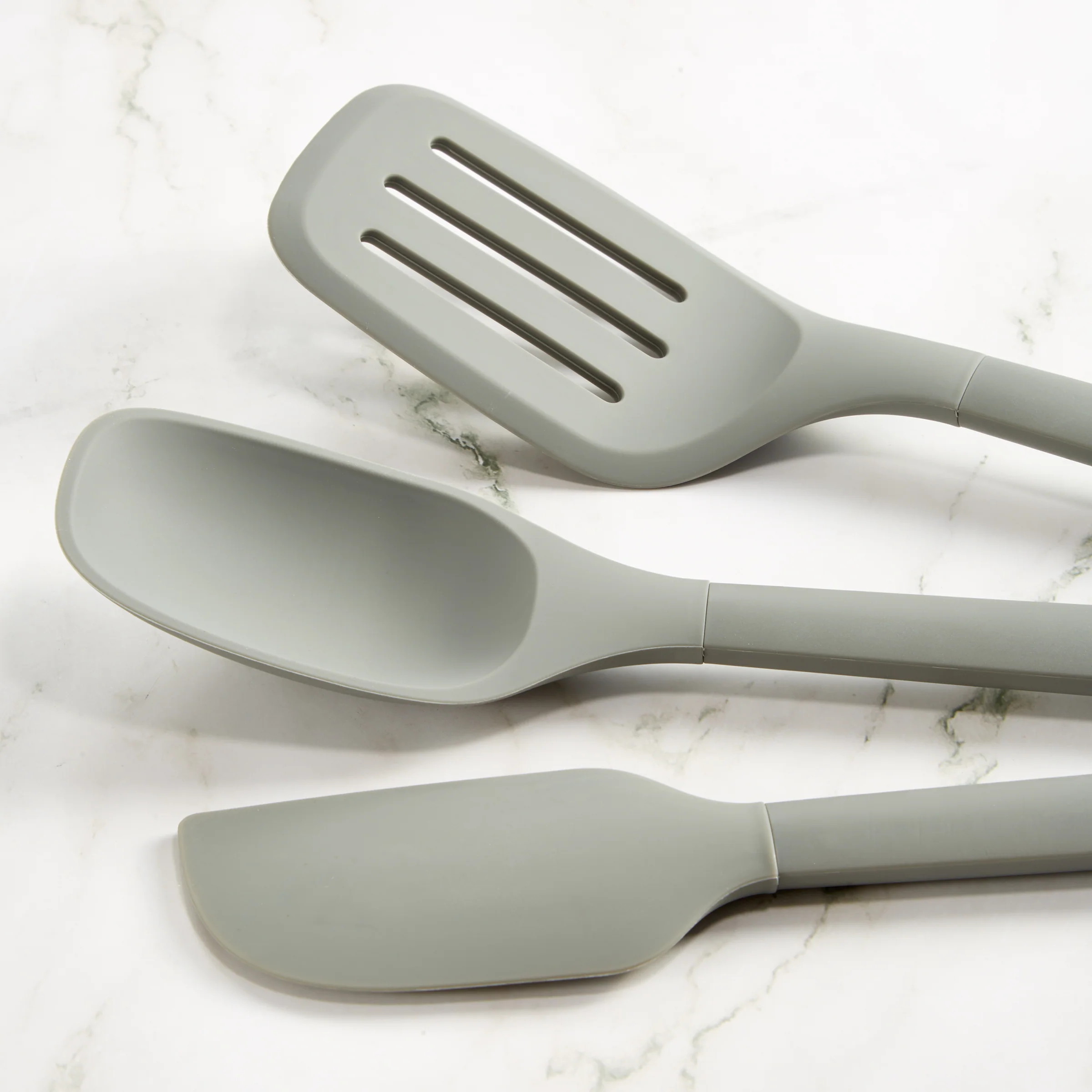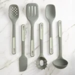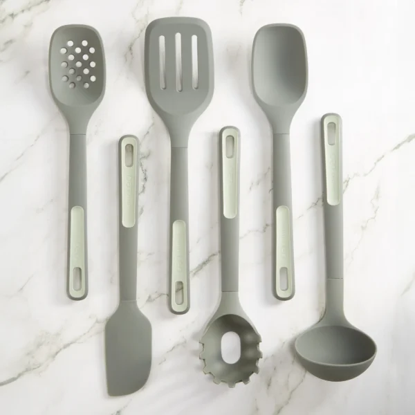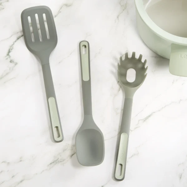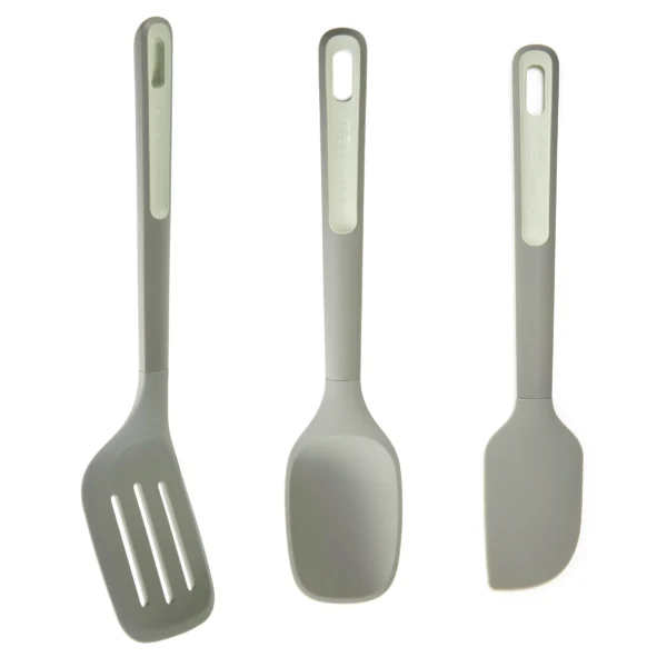 Flipping burgers or pancakes, frying eggs or removing cookies from a cookie sheet, it’s a piece of cake with this slotted turner partly made out of recycled plastic. Its heat resistant silicone head, made with recycled plastics, with thin flexible edge easily slides under all foods and is safe for use in non-stick coated cookware. The three slots allow excess liquid and oil to drain from your food. Once you’re done, the slotted turner can go in the dishwasher for a quick clean-up after which the hole in the handle allows for convenient hanging storage.