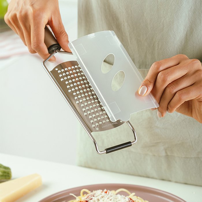 The handheld grater Misty by NAVA is ideal for shredding hard cheese, grating lemon, orange or chocolate, as well as grinding spices such as cinnamon or nutmeg.