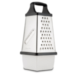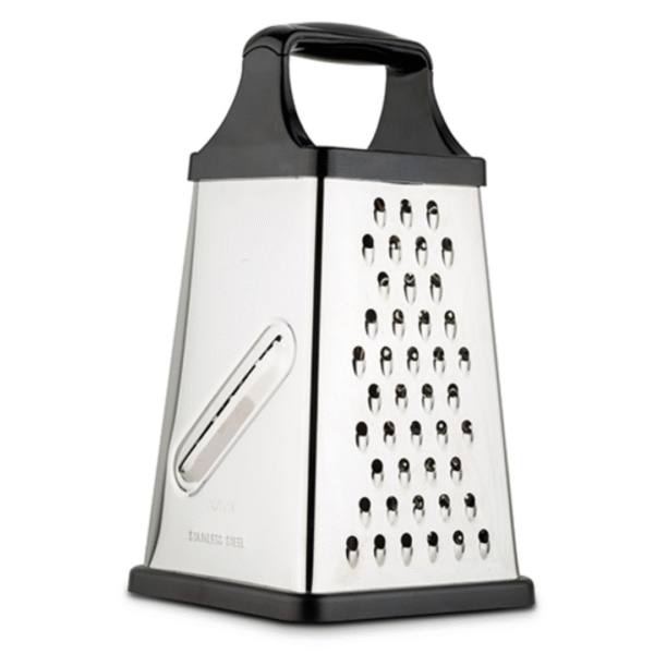 Made ofΒ 18/8 stainless steel, suitable for contact with food, features an ergonomic handle and non-slip baseΒ for stable and safe handling.Β Disposes an integrated plastic storage bowlΒ to grate and store directly andΒ 4 surfaces which offer you 4 different grating sizes, thick, medium, thin and one side to cut into thin slices.