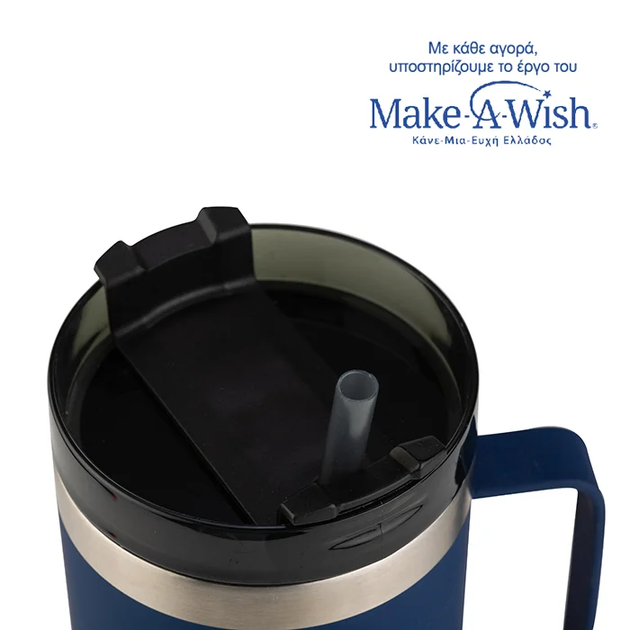 Stainless steel insulated travel mug with plastic straw “We Care”, dark blue 900ml