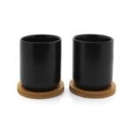 Set of two ceramic tea mugs. A perfect match for tea set Umea. Furthermore, the set contains two bamboo coasters to avoid hot mugs being placed directly on the table. Available in white and black.