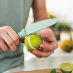 Cabbage, salad, eggplants, … you name it, the Leo vegetable knife will help you to slice, dice, chop or trim it. The mint coloured blade with non-stick coating glides right through all kinds of vegetables while the integrated zester allows you to add a fruity touch to your dishes as it zests limes, lemons and other citrus fruits with minimum effort. The knife comes with a protective sleeve for safe storage.